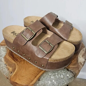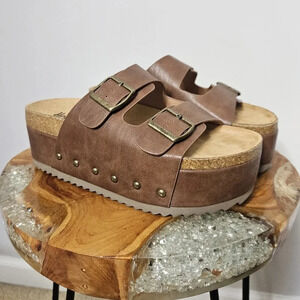 Style: Boho Faux Leather Vegan Similar to Free People Rule Breaker but are Corkys Brand Platform Chunky Sandals On Trend Blogger Favorite Wannabe Trending Brown Bronze Tone Buckle Studded Heel Similar to Birkenstock Freepeople Nailhead Like the Intentionally Blank Rulebreaker but are Corkys brand Hippie Bohemian Cooper Boutique Corky's Platform Shoes Slide Sandals
