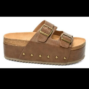 Style: Boho Faux Leather Vegan Similar to Free People Rule Breaker but are Corkys Brand Platform Chunky Sandals On Trend Blogger Favorite Wannabe Trending Brown Bronze Tone Buckle Studded Heel Similar to Birkenstock Freepeople Nailhead Like the Intentionally Blank Rulebreaker but are Corkys brand Hippie Bohemian Cooper Boutique Corky's Platform Shoes Slide Sandals