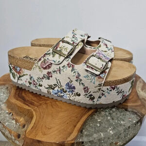 Style: Boho Floral Brocade Flowers Similar to Free People Rule Breaker but are Corkys Brand Platform Chunky Sandals On Trend Blogger Favorite Wannabe Trending Tan Brown Bronze Tone Buckle Studded Heel Similar to Birkenstock Freepeople Nailhead Like the Intentionally Blank Rulebreaker but are Corkys brand Hippie Bohemian Cooper Boutique Corky's Platform Shoes Slide Sandals