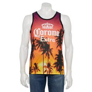Brand new with tags, officially licensed men's size graphic sleeveless tee tank top with a black fabric back and trim and a front panel that's a photorealistic tropical sunset with palm trees and the Corona Extra logo in white complete with crown above to celebrate the popular Mexican beer brand.