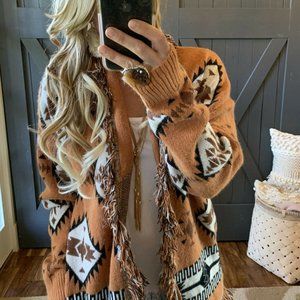 New Cozy Cowichan Print Boho Blanket Western Cardigan Sweater Coat. Open Front.