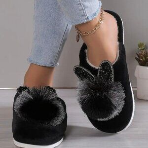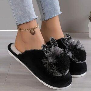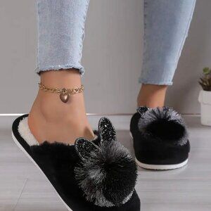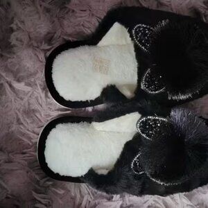 New Cozy Plush Furry Slippers with Black Cat Ears 7 1/2 8
