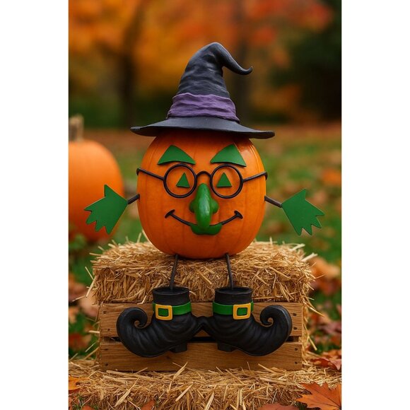 Bring your pumpkins to life with this New Creative “Witch Pumpkin Wear” set, including a witch’s hat, curly shoes, green nose, glasses, and hands. Designed to insert into your pumpkin for a whimsical outdoor Halloween display. Original box included. Pre-owned, with minor paint wear (see photos), but still displays beautifully for seasonal decorating.