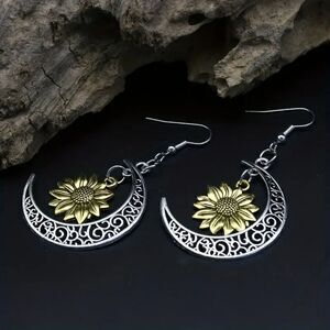 New - Crescent Moon and Sunflower Boho Drop Earrings