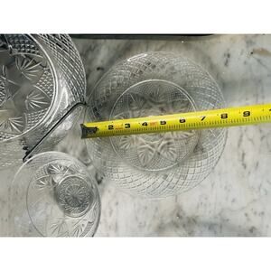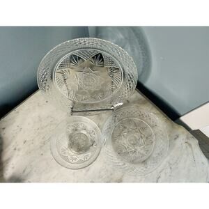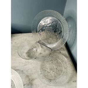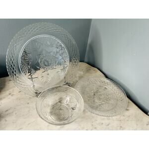 This vintage set by Arcoroc Cristal d'Arques Durand includes a dinner plate, lunch plate, and bowl in the Antique Clear pattern. The pieces are hand-blown crystal glass and are part of a contemporary reproduction collection. Perfect for serving meals in a classic, elegant style. Total of 8 sets available. Plates and bowls can also be purchased separately. Message me to discuss pricing.