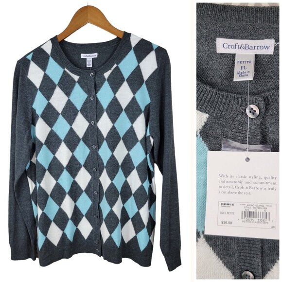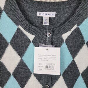 New Croft Barrow Cardigan Sweater size Large Petite Argyle Blue Gray Button Up
