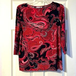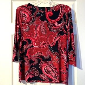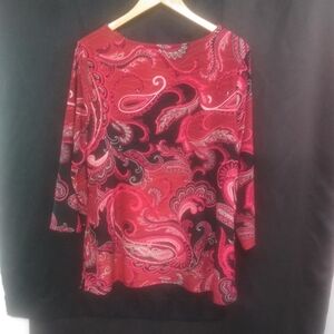 This is a gorgeous blouse-it is a dressy material so it can be dressed up or down.