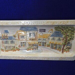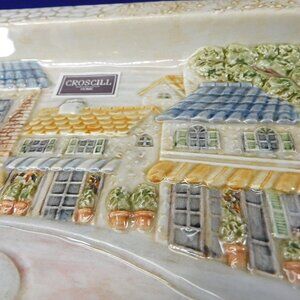 Charming Croscill Village Square ceramic tray features a detailed village scene, ideal for display.