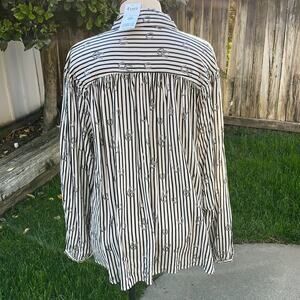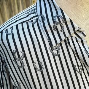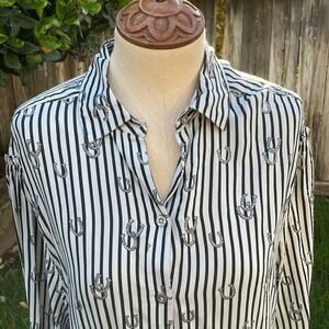 Cruel Denim Equestrian Horse Shoe Peasant Long Blouse. Womens size Medium. Brand new with Tag. Absolutely adorable black and white strips with grey horse shoes.