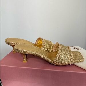 Elevate your style with these exquisite gold heels from Cult Gaia, featuring a luxurious woven texture. The shimmering gold finish adds a touch of elegance, making them perfect for any sophisticated occasion. Experience both comfort and style with these standout shoes.