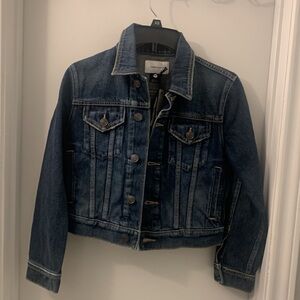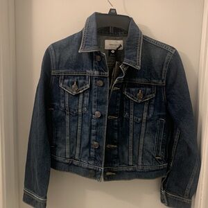 New with tags Current/Elliott The Baby Trucker Denim Jacket size 0 in the color 1 Year Worn Rig which is a medium dark indigo.