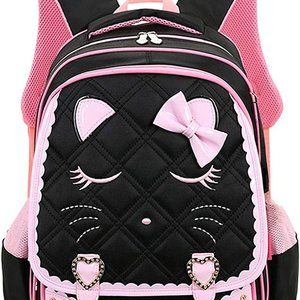 Color Options Black Rose Pink 2 Piece Set Nylon lining Zipper closure 11.4" shoulder drop ★Cute sweet cat smile face and bow princess design with Nylon material. ★Three colors, pink, rose, black for your choice. ★Structure: 1 main pocket, 1 vice pocket, 2 side mesh pockets ★Large:42*20*32 cm. Medium:39*17*29 cm ★Comfortable breathable widened straps and ventilation back design, effectively relieve shoulders pressure. SIZE: Unisex One Size CONDITION: New With Tags