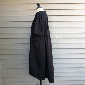 Soft jersey t-shirt with cotton sateen skirt. Side-seam pockets! Oversized relaxed fit. Faceted gem accents on front. Gathered skirt. Hi-low hem. Midi length. Easy, sophisticated elegance.