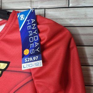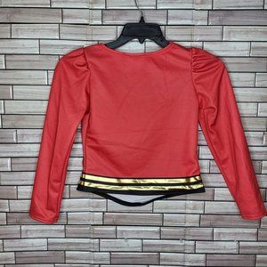 New costume for girls by Rubies. Girl’s SIZE LARGE (10-12). This 2-piece outfit are in the colors red, white, blue, and gold. The top is a long sleeve pullover with Wonder Woman logo on chest in gold and black and has black and gold trip on bottom of shirt. The skirt is all blue with white stars and has gold trim at bottom. Also, has an elastic waist band. This costume is NEW WITH TAGS. Made of 96% polyester, 4% spandex, and hand wash. Great for Halloween, trick or treating, or for playing dress up. See pictures for details. Message with any questions.