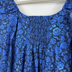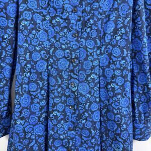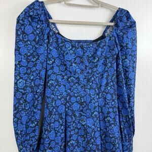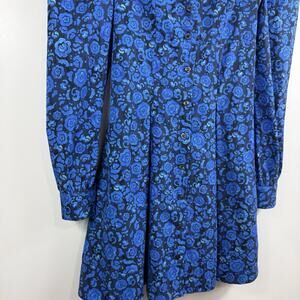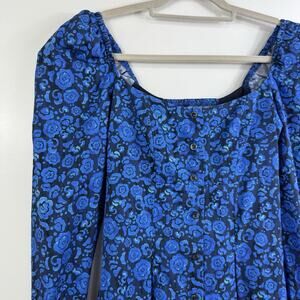 Featuring a beautiful floral pattern in black and blue colors, this dress has long puff sleeves and a full button closure for a feminine touch.