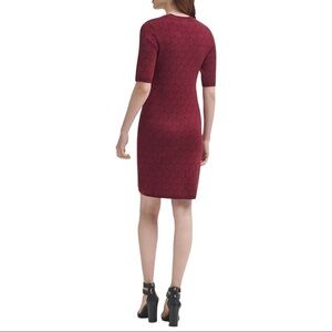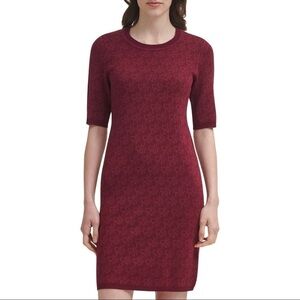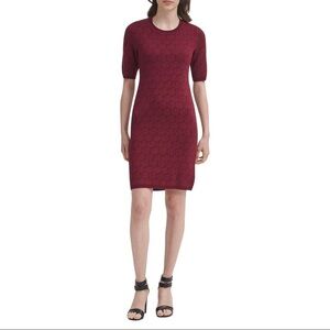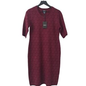 New! DKNY Bodycon Knit Short Sleeve Maroon Ribbed Trim Sweater Sheath Dress