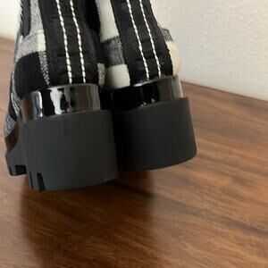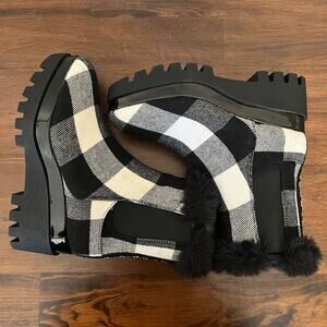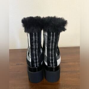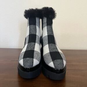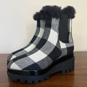 New DKNY Chelsea Black Bax Bootie Wedge Faux Fur Almond Toe Plaid Print