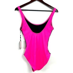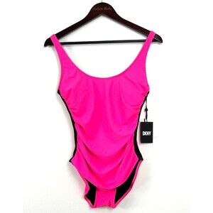 The DKNY one-piece swimsuit in size 8 is a stylish and practical choice for a hot pink beach vacation. This pink swimsuit features a tank top style with wide straps and a cheeky bottom style, making it perfect for lounging by the pool or hitting the beach. Made from a blend of polyester, nylon, and spandex, this swimsuit offers a comfortable fit with features like a built-in bra, tummy control, and UV protection. Perfect for a beachy theme, this swimsuit is lined and padded for a flattering silhouette.