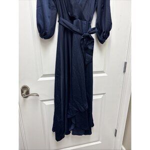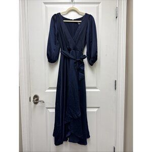 New DKNY Size 4 Navy Blue Balloon-3/4 Sleeve Faux-Wrap Gown Midi Dress Belted
