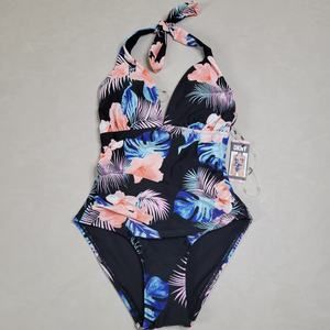 New DKNY Swimsuit Halter Shirred Waist Island Tropical Black Coral Small Lined
