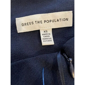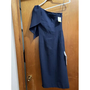 This is a stylish Dress The Population Tiffany One-Shoulder Midi Dress in Midnight Blue, size XS. It features a sleeveless one-shoulder neckline and falls to a midi length. The color is a deep Midnight Blue, and the style is a form-fitting sheath design. Perfect for a special occasion or evening event, this dress retails for $148.