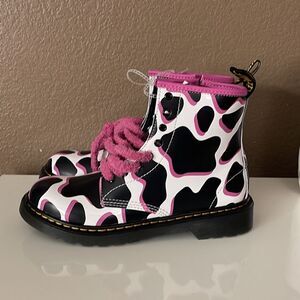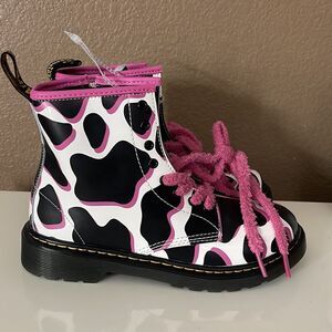 New DR. MARTENS KIDS' 1460 COMBAT BOOT IN WHITE COW PRINT size 5