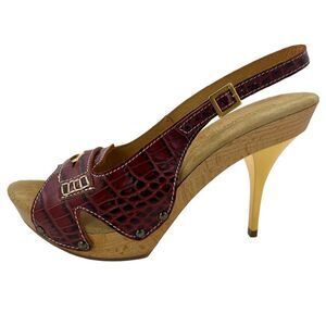 An architectural wooden platform and golden 80mm heel lends artistic style to this brown crocodile print leather heels with gold medallion and adjustable strap.