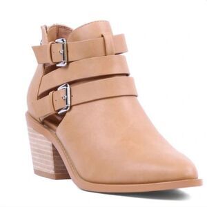 Dual buckles wraparound the shaft of a low cut bootie with a stacked heel for a simplistic, en vogue style.
