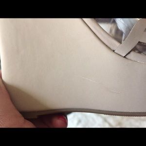 Bye, winter! A delicately feminine pair of open toe wedges, featuring an intricately laser-cut upper and ankle strap with front ankle buckle. Exposed heel. Super soft faux nubuck body. Cushioned insole. Never worn it does have a small scuff line on the right shoe. Can be touched up.