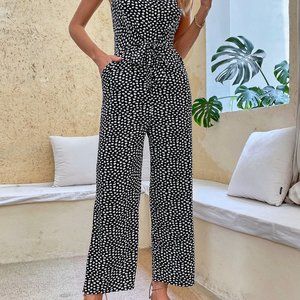 New Dalmatian Print Tie Front Slant Pockets Jumpsuit