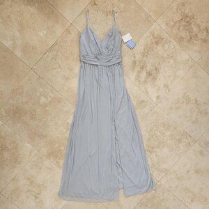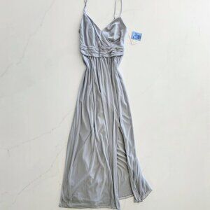 NWT Spaghetti Strap Ruched Waist V neck Mesh Long Mystic Blue Maxi Gown. Soft mesh bridesmaid with elegant pleating, adjustable straps, and stunning slit. One small pin hole (see pic)