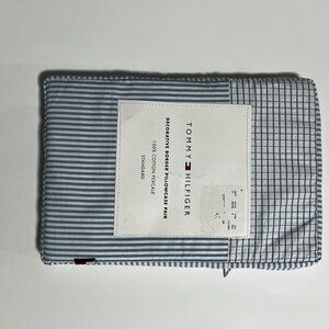 Tommy Hilfiger decorative border pillow case pair is made of 100% cotton percale and features a soft blue and white striped pattern. The dimensions are 20in x 30in (51cm x 76cm). These are machine washable. These have never been used.