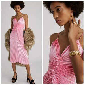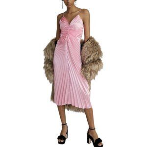 Delfi Collective Marilyn Dress, Delfi Collective pink dress, Delfi midi dress, pleated pink dress, spaghetti strap pink dress, pink cocktail dress, pink party dress, designer pink dress, Delfi Collective size small, v-neck pleated dress, boutique pink midi
