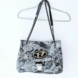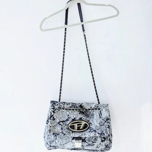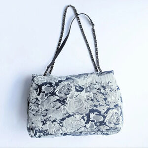 Navy Blue/White, Denim Distressed Canvas adjustable chain shoulder, flap bag with: •Silver metal buckle snap closure