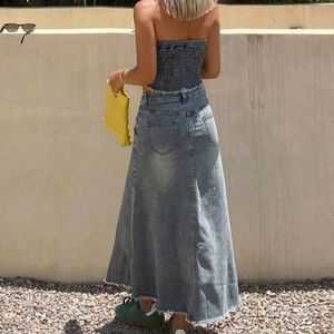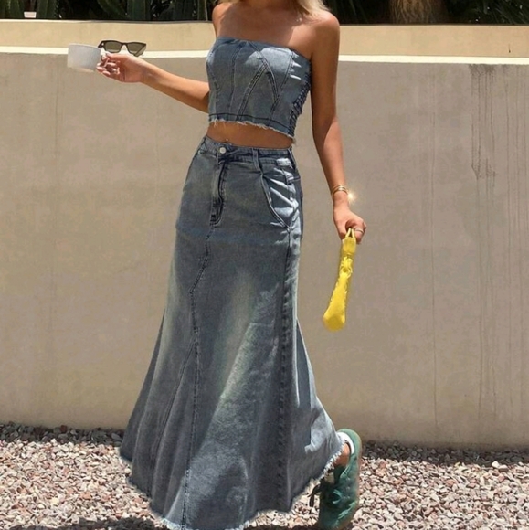 Stylish denim two-piece set featuring a strapless top and long skirt. Perfect for casual outings.
