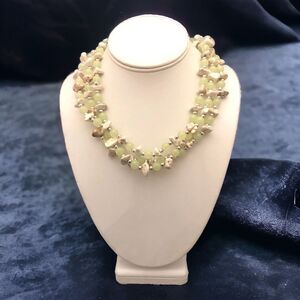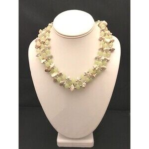 This gorgeous necklace is silver toned and features multiple strands of simulated natural stones and green beads.
