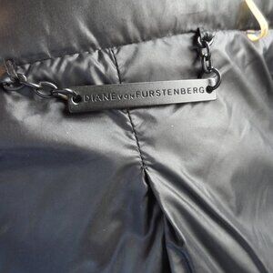 Chic, warm, and impeccably crafted, this Diane von Furstenberg (DVF) black quilted coat delivers modern sophistication and winter-ready comfort. With a luxurious faux fur-trimmed hood and a flattering belted silhouette, it’s the perfect outerwear piece for cold-weather elegance. Details: Designer: Diane von Furstenberg.Color: Black. Size: Small. Features: Diamond quilted design. Detachable hood with plush black faux fur trim. Full double way front zip closure with DVF-logo zipper pulls. Matching adjustable belt with DVF logo buckle. Two front zip pockets and one arm zip pocket. Inner knit cuffs for extra warmth. Fully lined and down-filled for superior insulation. Cuffs with finger slits. Measurements are approximate: Shoulders 14", bust 36", waist 32", hips 38", length 34". Condition: Brand new (never worn). Sales tags were removed. Retail for $899.