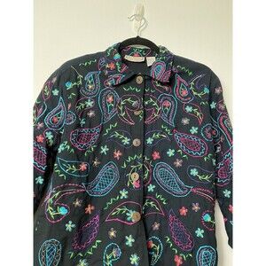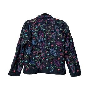 New Direction Embroidered Jacket Top Multicolor Linen Cotton Blazer Size PM petite medium paisley floral long sleeves pre owned one of the buttons is broken please see pictures for more details please check measurements could be S/M regular