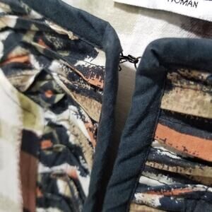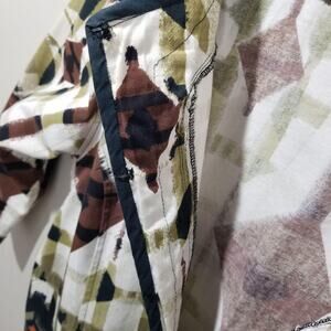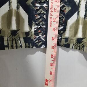Color: Multicolor geometric Aztec/tribal print in cream, olive green, brown, black, and orange.