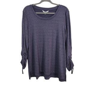 New Direction long sleeve tee with gathering and drawstring at end of sleeves. Features a rounded neckline and a laser-cut striped pattern. The fabric is lightweight in a dark blue color. New with tags!