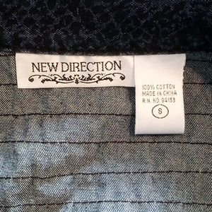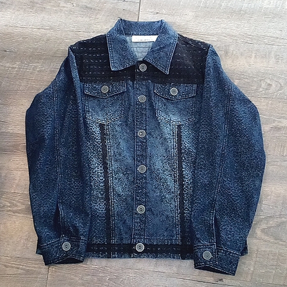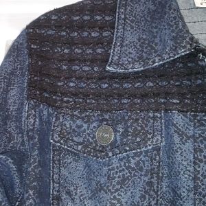 New Direction Dark Wash Snake Pattern Jean Jacket is so unique and versatile. It is a size Small. The jacket can go with pretty much anything and adds some flavor to any outfit. It has lace on the top part of the front of the jacket, the top back part and lace trim around the bottom.
