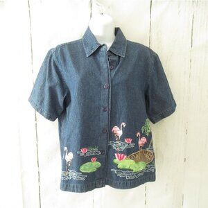 New Direction Top L Denim Embroidered Flamingo Palm Tree Cruise Resort Wear