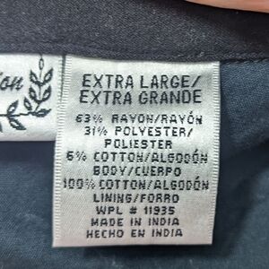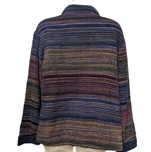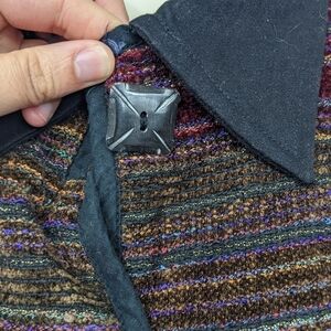 This jacket is in gently used condition. It is a button down style. It features a velvet collar and cuffs. The material features metallic thread woven in. It is lined. Please see photos for details.