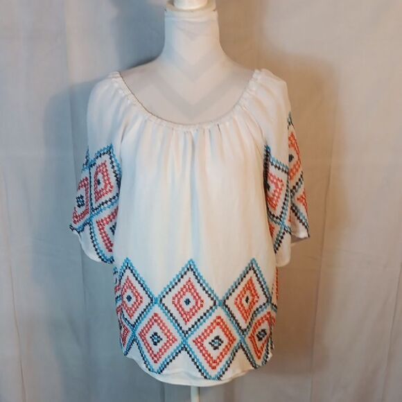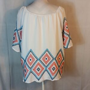 Stylish white top featuring a vibrant embroidered geometric pattern. Size Large with a pit to pit measuring 21" and a length of 26". Perfect for casual outings.