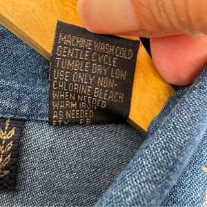 Features: New Direction denim button down short sleeve shirt with embroidered palm trees. Perfect for Hawaii or a tropical vacation.