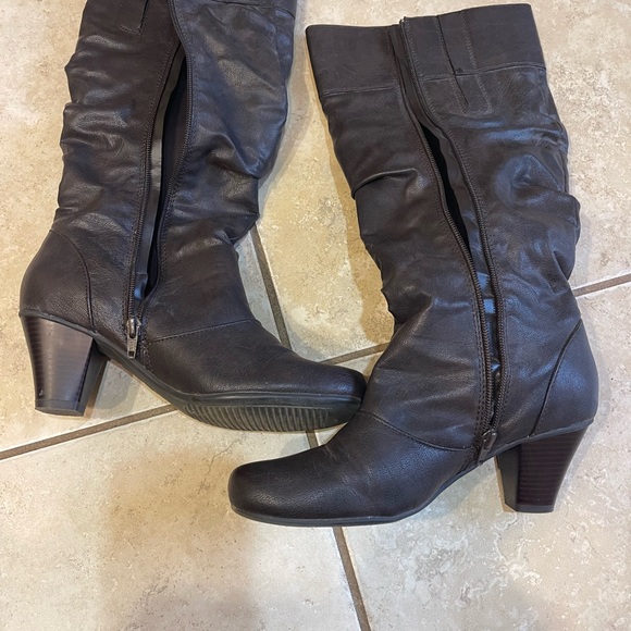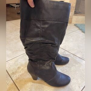 New Direction boot. Size 9. Knee length with slight slouch. Heel measures 2 inches. Very comfortable due to stacked nature of heel.