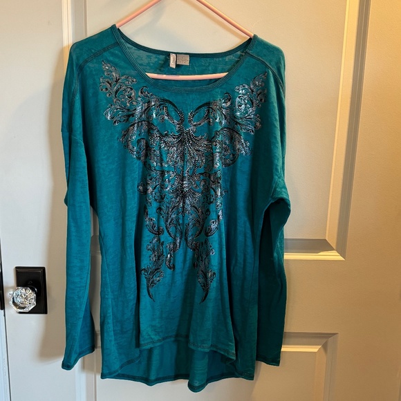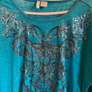 New Direction weekend size large turquoise t-shirt with a great design on the front