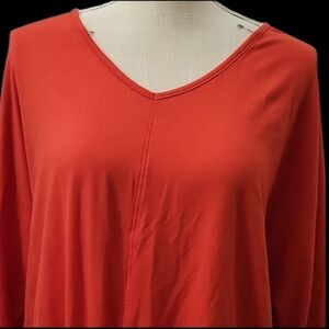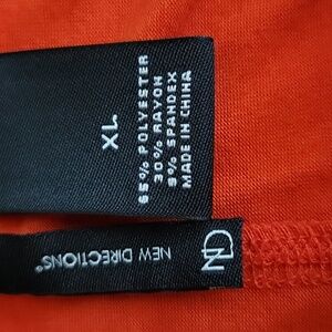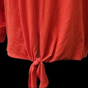This relaxed blouse from New Directions features a vibrant red hue and a stylish tie front detail. With its 3/4 sleeves and soft, draping fabric, it offers both comfort and a chic look for any casual occasion. Size XL. Smoke free home