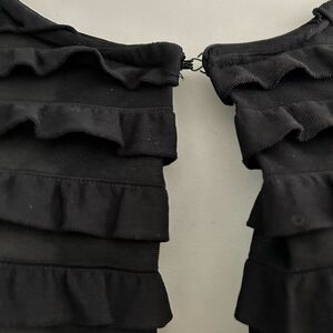 New Directions layered ruffle cardigan. All black stretchy material. Front hook closure at the neck.