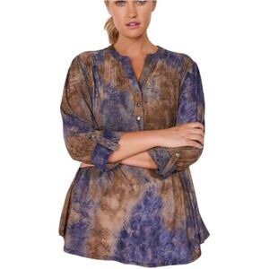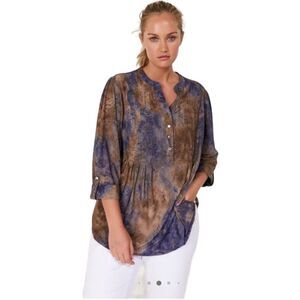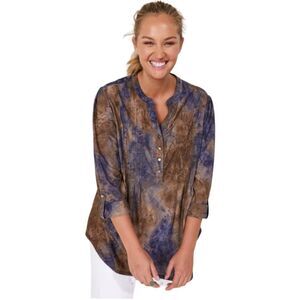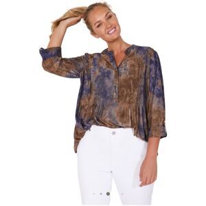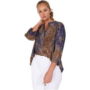 Stylish blouse with button details. Features a blend of blue and brown tones. Perfect for casual wear.